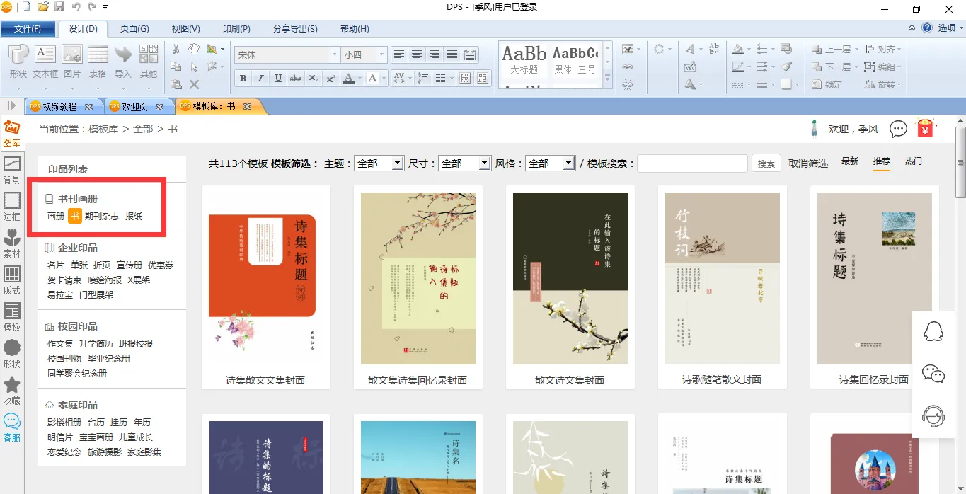 第二步,打开【模板库】,在【书刊画册】中选择【书】,就能找到许多散文集模板。