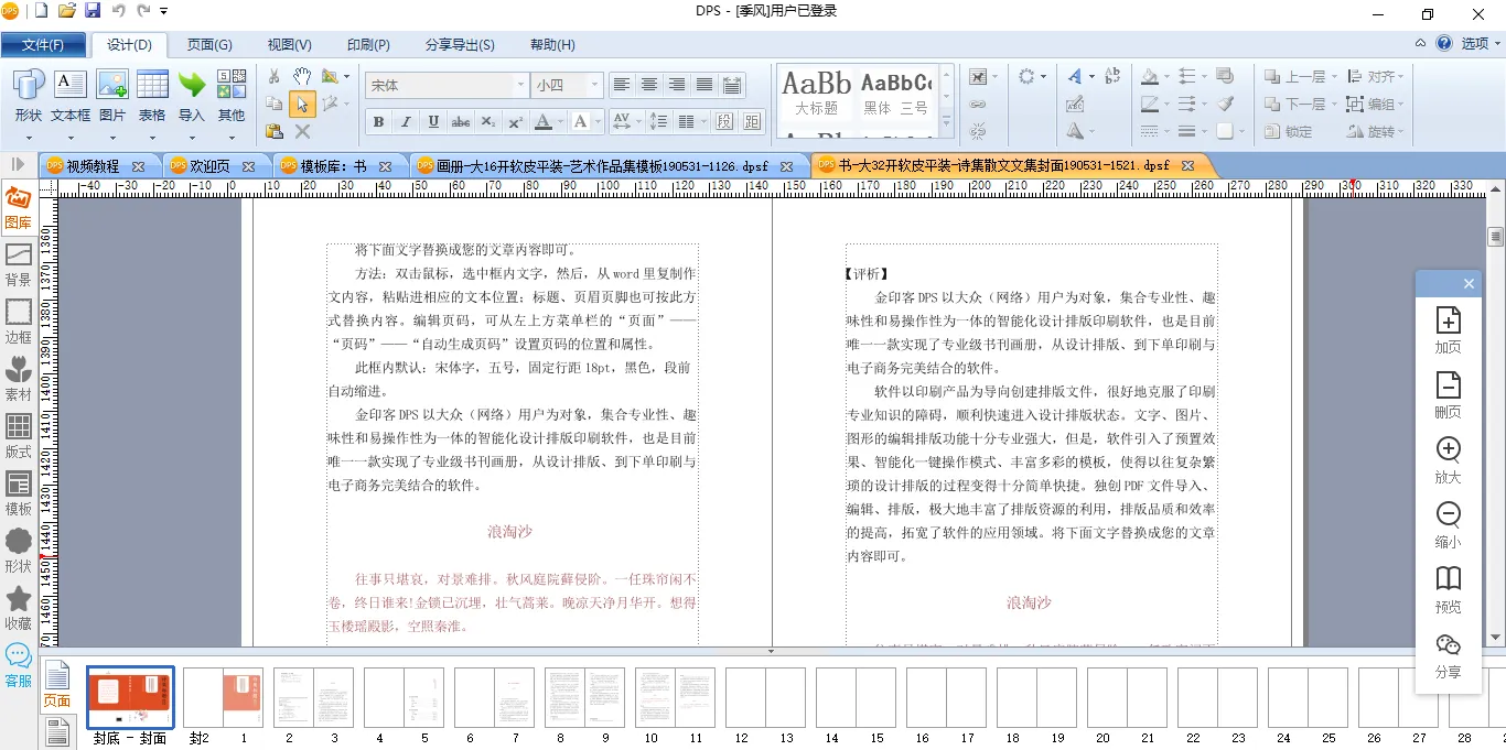 这些模板全部可以免费使用。你只需要在电脑上下载金印客DPS设计排版印刷分享软件,然后将选中的模板在软件中打开,就可以在模板中编辑内容了。替换掉模板的文字和图片,一本属于你的书籍就完成了。