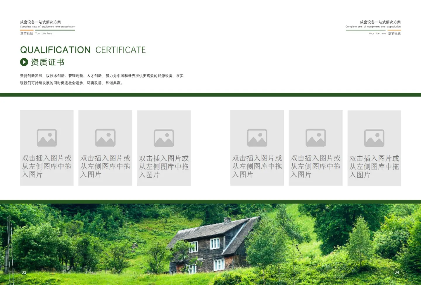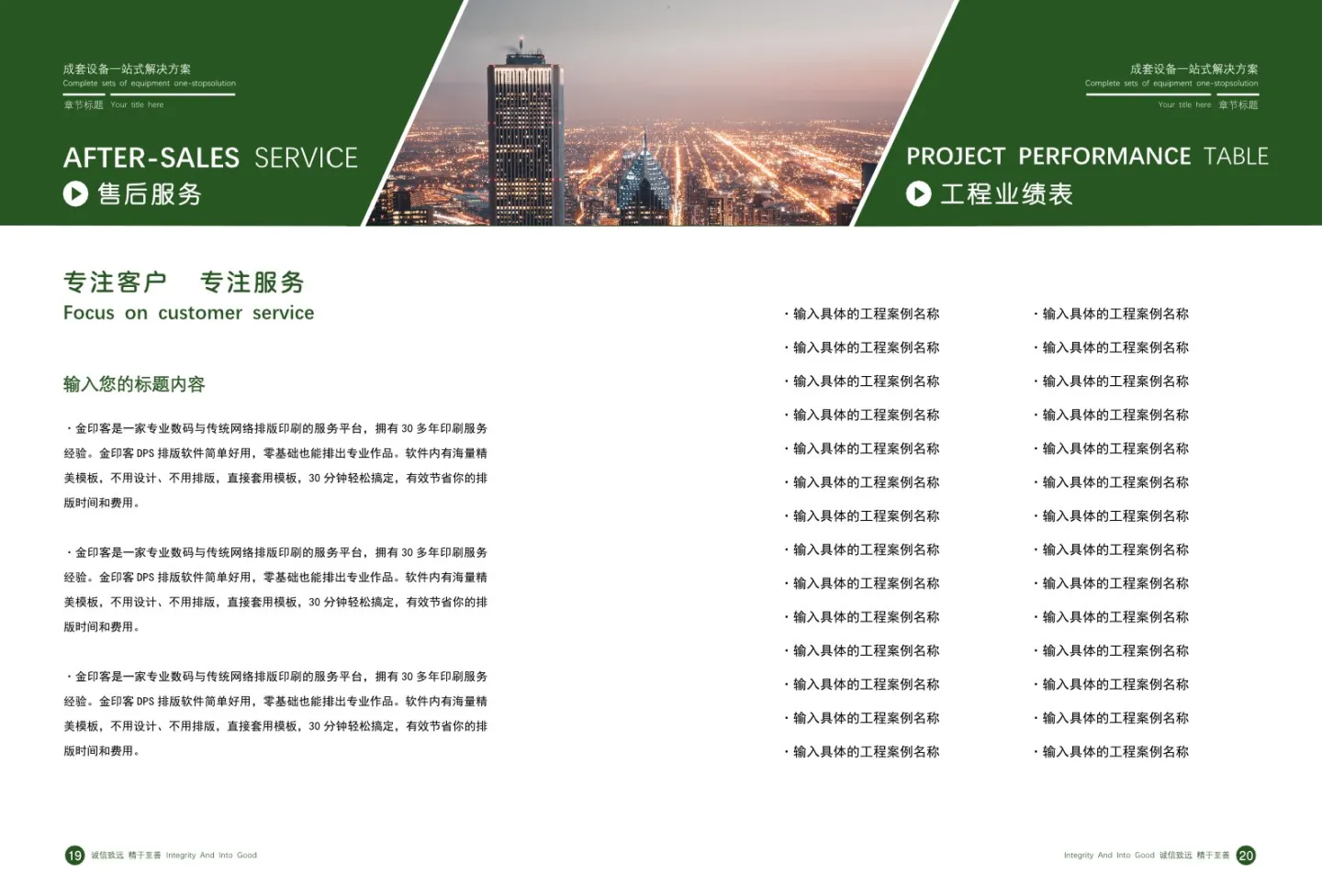 下面我们来详细看一下模板中包含有哪些板块。这里有公司介绍、企业文化、资源证书、生产场景、生产车间、服务领域、产品介绍、工程案例、业绩表、售后服务等10个部分内容,基本上涵盖了生产企业所需要宣传和展示的内容。