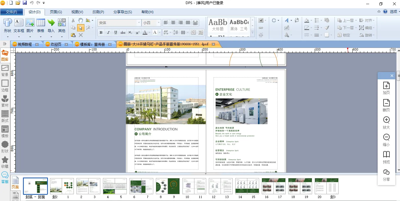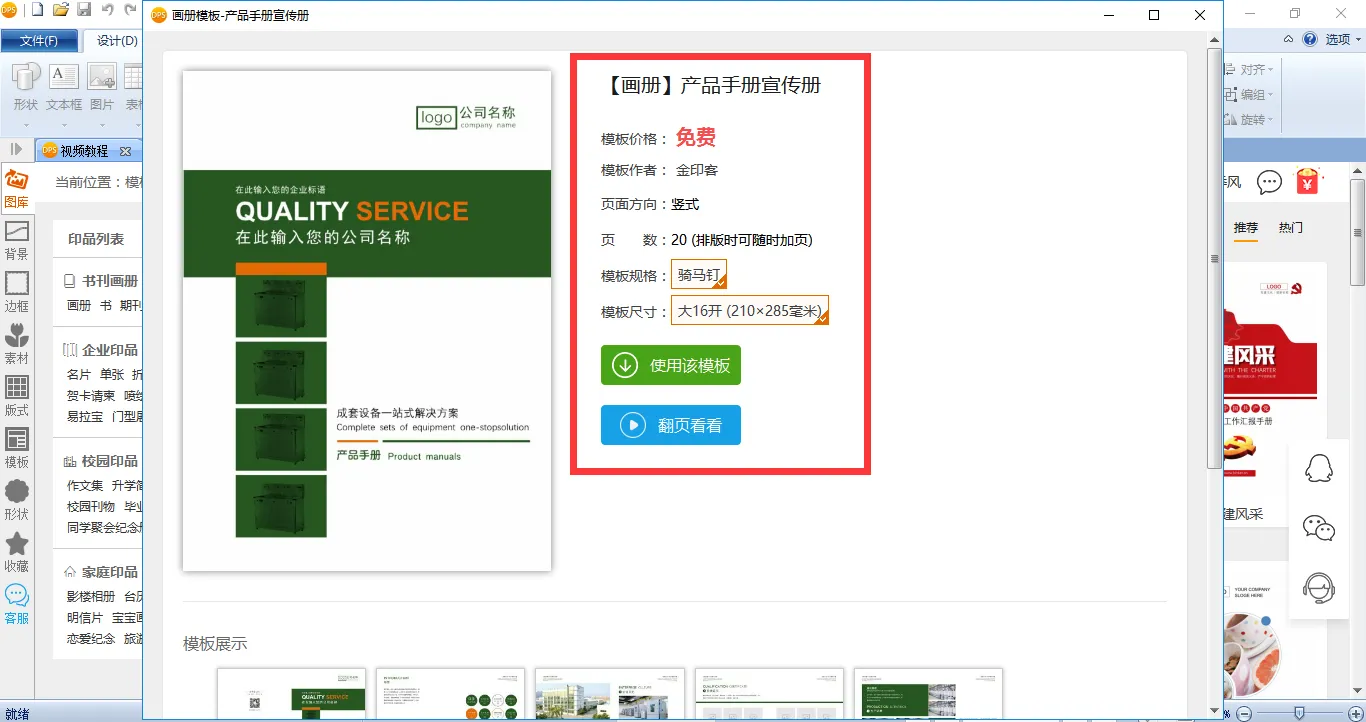 首先在电脑上免费下载金印客DPS设计排版印刷分享软件,打开【模板库】,选择【企业印品】——【宣传册】,就可以找到该模板,模板是可以免费使用的。